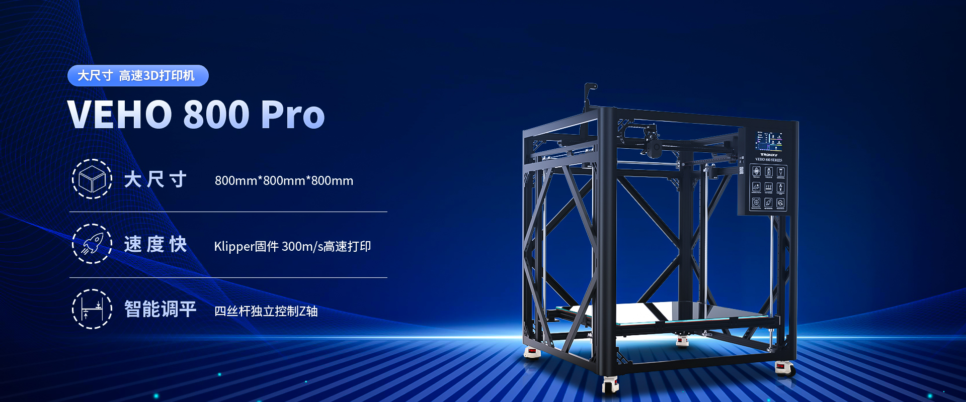 自主設計,定制生產線,可生產從桌面級到工業級等 尺寸從180mm到1.6米的3D打印機